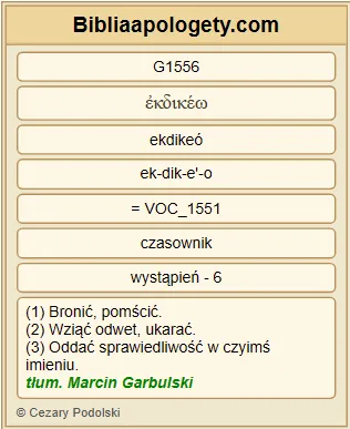 | L07 | Rz12_19 | Umiłowani G27 , nie wymierzajcie sami sobie sprawiedliwości G1556 , lecz pozostawcie to pomście G3709 ! Napisano bowiem G1125 : Do Mnie G1698 należy pomsta G1557 . Ja G1473 wymierzę zapłatę G467 – mówi G3004 Pan G2962 . |