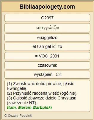 | L07 | Rz15_20 | A moim honorem G5389 było głosić G2097 Ewangelię tam, gdzie imię Chrystusa G5547 było jeszcze nie znane G3687 , by nie budować G3618 na fundamencie G2310 kogoś innego G245 . |