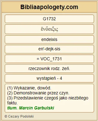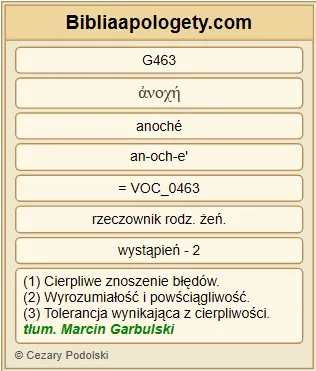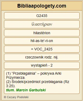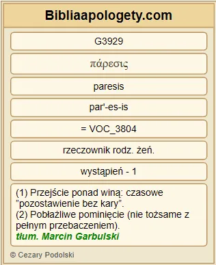 | L07 | Rz3_25 | Jego G3739 to ustanowił G4388 Bóg G2316 narzędziem przebłagania G2435 przez G1223 wiarę G4102 mocą G1722 Jego G846 krwi G129 , by G1519 ukazać G1732 sprawiedliwość G1343 Jego G846 , ponieważ G1223 w G1722 cierpliwości G463 Bożej G2316 przeszłe grzechy G265 zostały przebaczone G3929 , |