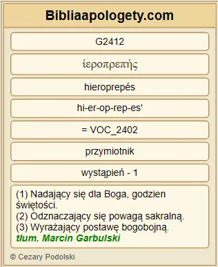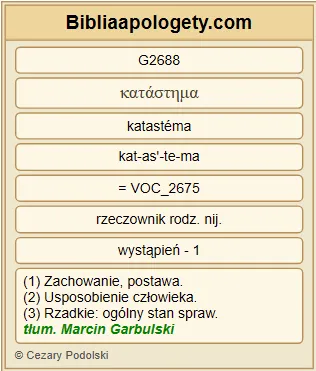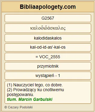 | L07 | Tt2_3 | Podobnie G5615 starsze kobiety G4247 winny być G1511 w zewnętrznym ułożeniu G2688 jak najskromniejsze G2412 , nie G3361 plotkarkami G1228 , nie G3361 pijaczkami G1402 wina G3631 , a nauczycielkami G2567 dobrego . |