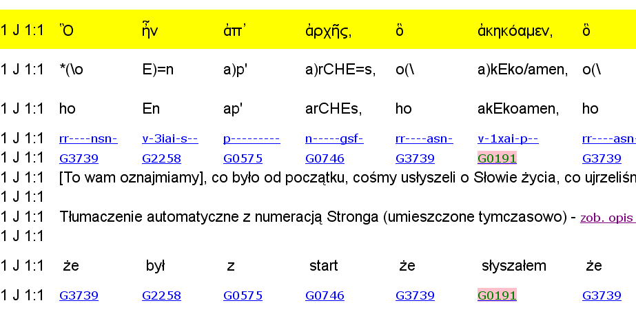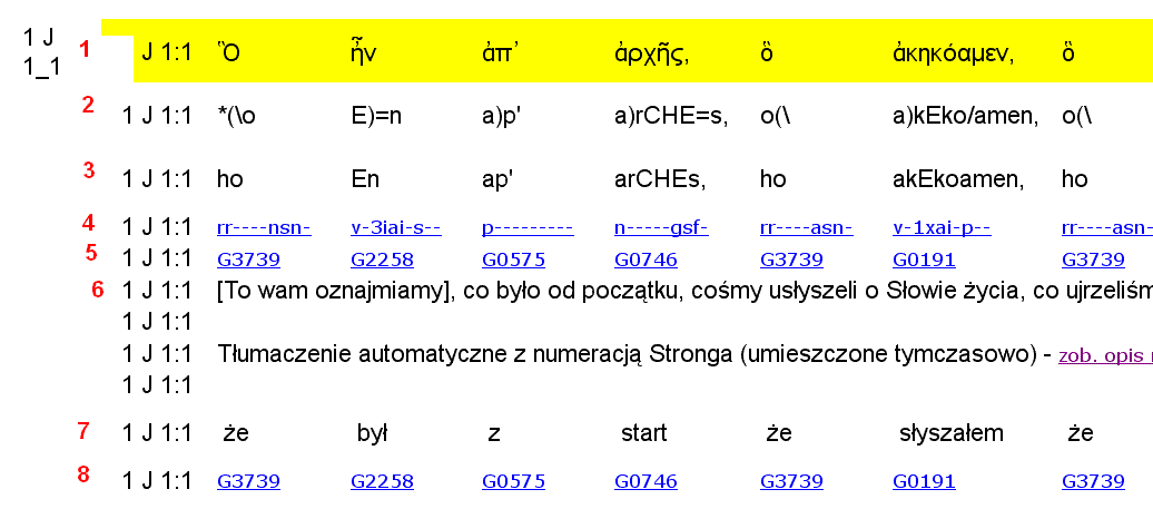 7 - tekst przetłumaczony automatycznie przez usługę "Google Tłumacz", oparty na projekcie Romana Korovyatskiego (jest to przekład rosyjski opatrzony numeracją Stronga). Tekst grecki użyty w tym projekcie jest oparty na innej recenzji niż tekst, który jest umieszczony w linii nr 1 (stąd numeracja Stronga z linii nr 5 nie zawsze pokrywa się z tą z linii 8). Tłumaczenie automatyczne sprawia, że pewna część wyrazów jest przetłumaczona dość zabawnie; są powtórzenia, słowa niezrozumiałe, dwa lub trzy słowa nieraz mają ten sam numer Stronga (ale to wynika ze specyfiki kodu Romana Korovyatskiego). Nieraz widać pośrednictwo języka angielskiego w tym tłumaczeniu (np. słowo "wstali, powstali" jest w tłumaczeniu automatycznym oddane jako "róża" a to dlatego że "tłumacz automatyczny" słowo rosyjskie przetłumaczył najpierw na angielskie "rose", które oznacza zarówno" różę" jak i "powstali" i tłumacząc dalej na polski niestety wybrał złą opcję). Wiele niejasności można rozwiązać porównując tłumaczenie automatyczne z tekstem Biblii Tysiąclecia. Uznałem więc za pożyteczne umieścić tłumaczenie automatyczne, gdyż w bardzo dużym stopniu pozwala na zrozumienie i naukę słów greckich.