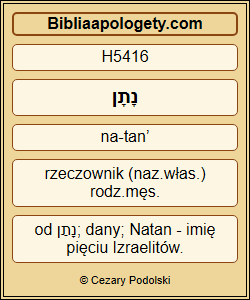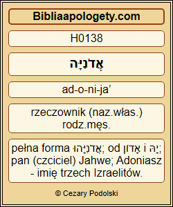 Wtedy Natan H5416 zapytał H559 Batszebę H1339 , matkę H517 Salomona H8010 : Czyś nie słyszała H8085 , że zaczął królować H4427 Adoniasz H138 , syn H1121 Chaggity H2294 ? A pan H113 nasz, Dawid H1732 , o tym nie wie H3045 ! |