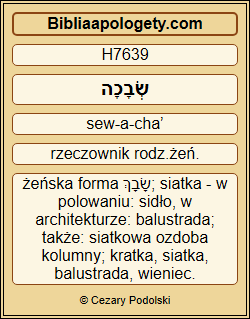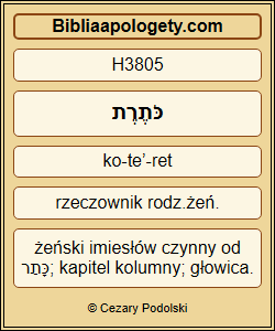 Ponadto głowice H3805 na obydwu H8147 kolumnach H5982 , zarówno ponad spojeniami H5980 na tle splotów H7639 , jak i blisko przy nich, miały dokoła H5439 dwieście H3967 jabłek granatu H7416 na jednej H259 głowicy H3805 i tak samo na drugiej H8145 głowicy H3805 . |