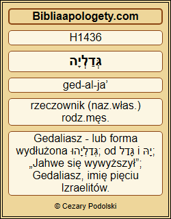 Z Jedutuna – synowie H1121 Jedutuna: Gedaliasz H1436 , Seri (Zeri) H6874 , Izajasz H3470 , Chaszabiasz H2811 , Mattitiasz H4993 i Szimei H8096 – sześciu H8337 pod kierunkiem H3027 ich ojca H1 Jedutuna H3038 , który prorokował H5012 na cytrze H3658 na cześć i chwałę Pana H3068 . |