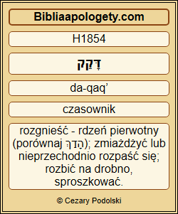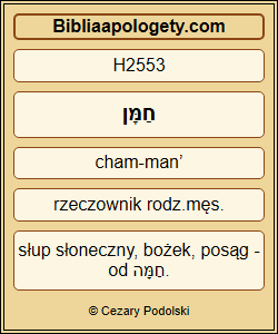 W jego obecności H6440 burzono H5422 ołtarze H4196 Baalów H1168 ; zwalił H5422 on stele słoneczne H2553 , które były H1961 na nich u góry H4605 , połamał H7665 aszery H842 , posągi rzeźbione H6456 i odlewane z metalu H4541 , pokruszył H1854 je, zmiażdżył H1854 , a szczątki H6083 ich porozsypywał H2236 na grobach H6913 tych, którzy im składali H2076 ofiary H2077 . |