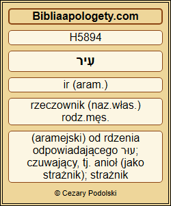 Patrzyłem H2370 , w H5922 moim H1992 łożu H4903 , na H5922 obrazy H2376 [istniejące] w H5922 mojej H1992 głowie H7217 , a H2006 oto H2006 Czuwający H5894 i H6922 Święty H6922 zstępował H5182 z H4481 nieba H8065 . |