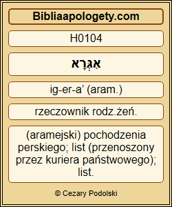 Odpis H6573 listu H104 , który Tattenaj H8674 , namiestnik H6347 Transeufratei H5675 , i Sztarboznaj H8370 oraz towarzysze H3675 jego, Persowie H6540 w Transeufratei H5675 , posłali H7972 do króla H4430 Dariusza H1868 . |