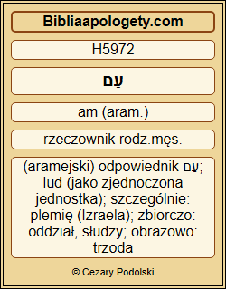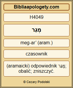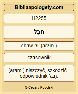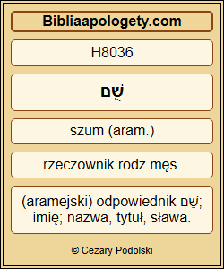 A Bóg H426 , który H1768 umieścił tam H7932 swoje Imię H8036 , niech obali H4049 każdego H3606 króla H4430 lub lud H5972 , który H1768 odważy się zaszkodzić H8133 lub zniszczyć H2255 ten H1791 dom H1005 Boży H426 w Jerozolimie H3390 . Ja H576 , Dariusz H1868 , wydałem H7761 ten dekret H2942 – niech będzie wykonany H5648 pilnie H629 . |