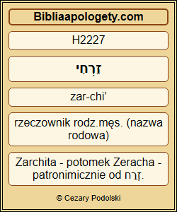 Następnie kazał wystąpić H7126 rodom H4940 Judy H3063 i został wskazany losem H3920 ród H4940 Zeracha H2227 . Po czym kazał wystąpić H7126 rodowi H4940 Zeracha H2227 rodzinami H1004 i została wskazana losem H3920 rodzina H4940 Zabdiego H2067 , |