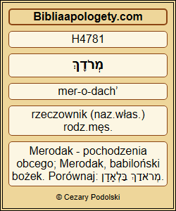 Ogłoście H5046 wśród H8432 narodów H1471 i H8085 obwieszczajcie H8085 ! Wznieście H5375 znak H5251 i H559 głoście H5046 ! Bez H3808 obsłonek H3582 mówcie H559 : Babilon H894 zdobyty H3920 ! Bel H1078 pohańbiony H954 ! Merodak H4781 rozbity H2865 ! Bóstwa H6091 ich H1992 są H1961 okryte H954 hańbą H2781 , pokruszone H2865 zostały H1961 ich H1992 bałwany H1544 ! |