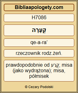 Jego H7133 dar H7133 ofiarny H7133 stanowiły: H1961 misa H7086 srebrna H3701 wagi H4948 stu H3967 trzydziestu H7970 syklów, H8255 czara H4219 srebrna H3701 wagi H4948 siedemdziesięciu H7657 syklów - H8255 według H4948 wagi H8255 przybytku H6944 - obydwie H8147 napełnione H4392 najczystszą H5560 mąką H5560 zaprawioną H1101 oliwą H8081 na H5921 ofiarę H4503 pokarmową, H4503 |