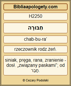 | L16 | Prz20_30 | 30 The blueness <02250> of a wound <06482> cleanseth <08562> away evil <07451>: so do stripes <04347> the inward parts <02315> of the belly <0990>. | |||||||||