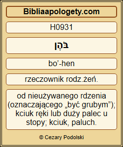 Potem zabijesz H7819 barana H352 , weźmiesz H3947 jego krew H1818 i pomażesz H5414 nią czubek prawego H3233 ucha H241 Aarona H175 i czubek prawego H3233 ucha H241 jego synów H1121 oraz kciuk H931 ich prawej H3233 ręki H3027 i wielki palec H931 ich prawej H3233 nogi H7272 , a pozostałą H7604 krew H1818 wylejesz H2236 na ołtarz H4196 dokoła H5439 . |