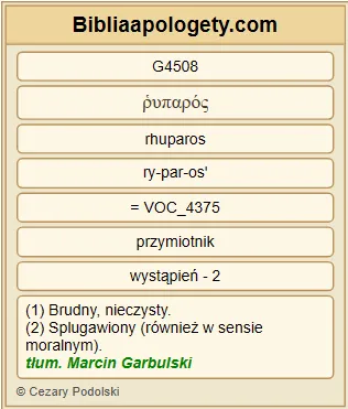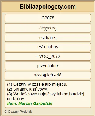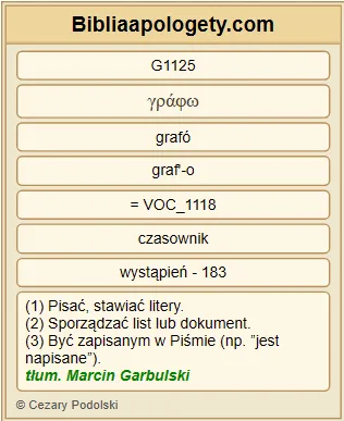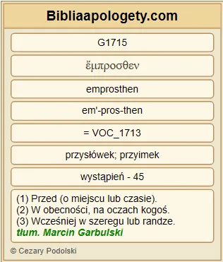 Mówi G3004 Ten, który świadczy G3140 o tych G5023 rzeczach: Zaiste G3483 , przyjdę G2064 niebawem G5035 . Amen G281 . Przyjdź G2064 , Panie G2962 Jezu G2424 ! |