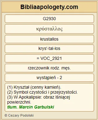 I ukazał G1166 mi G3427 rzekę G4215 wody G5204 życia G2222 , lśniącą G2986 jak G5613 kryształ G2930 , wypływającą G1607 z G1537 tronu G2362 Boga G2316 i G2532 Baranka G721 . |