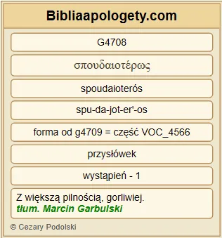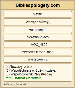 bo G3754 dla sprawy G2041 Chrystusa G5547 bliski był G1448 śmierci G2288 , naraziwszy G3851 życie swoje G5590 , po to G2443 , by was zastąpić G378 przy posłudze G3009 , której wy [osobiście] nie mogliście mi oddać G5303 . |