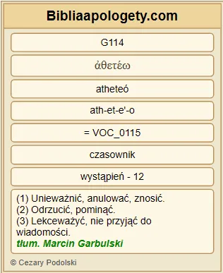 Nie G3756 mogę odrzucić G114 łaski G5485 danej przez Boga G2316 . Jeżeli G1063 zaś usprawiedliwienie G1343 dokonuje się G1096 przez Prawo G3551 , to G686 Chrystus G5547 umarł G599 na darmo G1432 . |