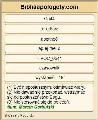 Kto G3588 wierzy G4100 w G1519 Syna G5207 , ma G2192 życie G2222 wieczne G166 \ kto zaś G1161 nie wierzy G544 Synowi G5207 , nie G3756 ujrzy G3708 życia G2222 , lecz G235 grozi mu G3306 gniew G3709 Boży G2316 . |