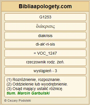 Kto zaś ma wątpliwości G1252 i jada G5315 , ten już siebie potępił G2632 , bo nie postępuje zgodnie z wiarą G4102 . Wszystko G3956 bowiem, co się czyni niezgodnie z wiarą G4102 , jest grzechem G266 . |