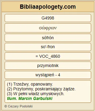 Starcy G4246 winni być G1511 ludźmi trzeźwymi G3524 , statecznymi G4586 , roztropnymi G4998 , odznaczającymi się zdrową G5198 wiarą G4102 , miłością G26 , cierpliwością G5281 . |
